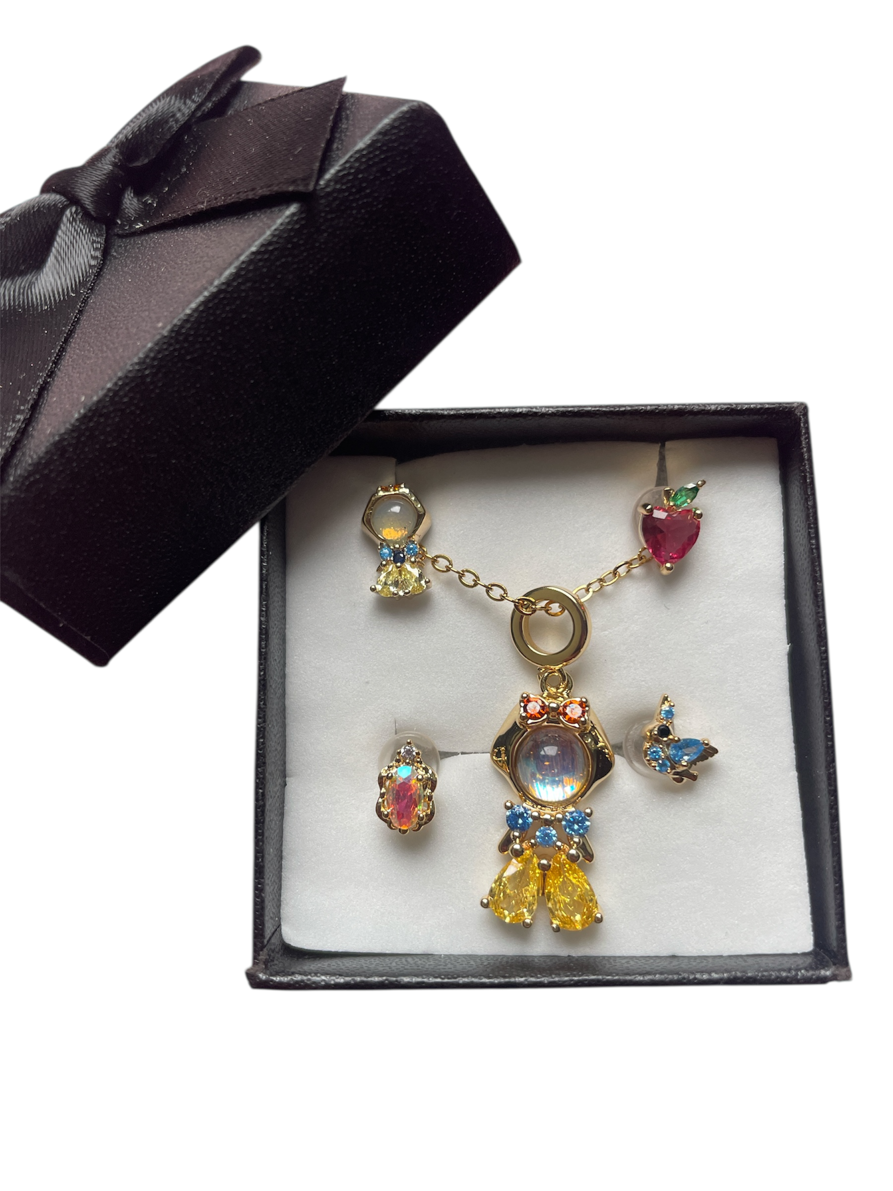 Conjunto com kit de brincos e colar. Kit com 4 personagens do filme A Branca de Neve e os 7 Anões. Composto por 1 Princesa Branco de Neve, 1 Maçã, 1 Espelho Mágico e 1 Passarinho. Detalhes em zircônias coloridas. Tamanhos: em torno de 0,4cm. Corrente modelo elos portugueses com pingente da Branca de Neve, princesa do filme A Branca de Neve e os 7 Anões da Disney. Tamanho da Corrente: 45cm de comprimento + extensor de 5cm x 0,1cm de espessura. Pingente com 0,6cm. Joia com banho de Ouro 18K.