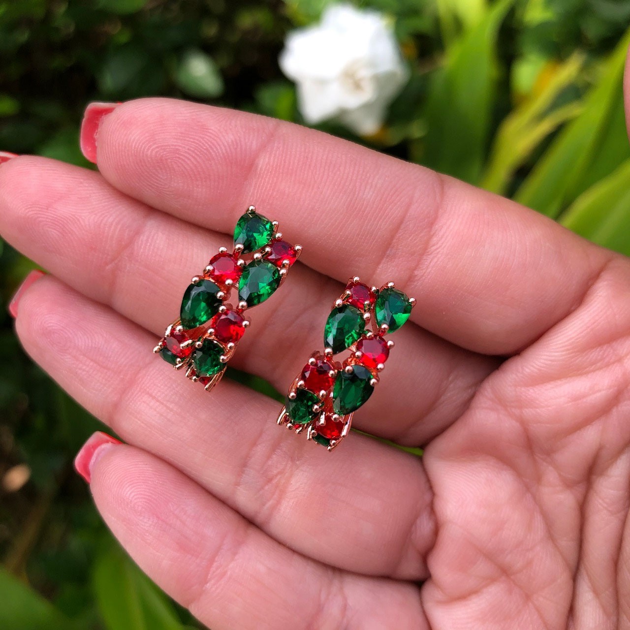 Brincos meia argola com zircônias verdes imitando Esmeraldas e e vermelhas imitando Rubis. Tamanho: 2,5cm x 1cm. Joia com banho de Ouro Rosê 18K.